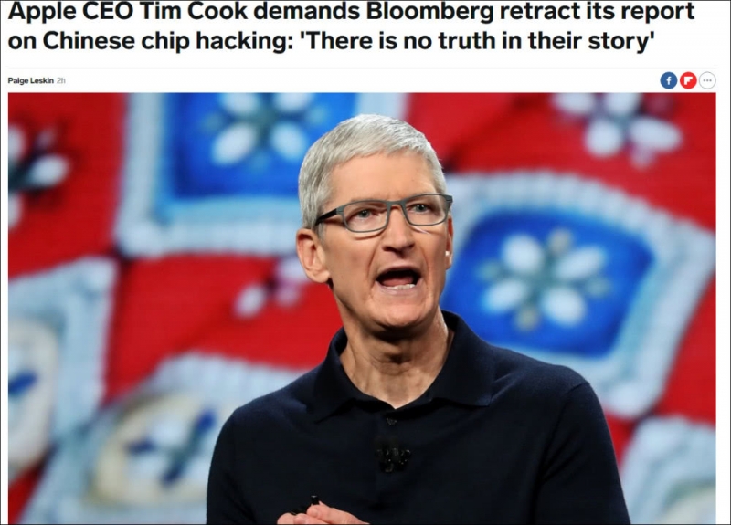 据美媒BuzzFeed新闻报道,当地时间18日晚,苹果公司CEO蒂姆·库克(Tim Cook)在接受采访时首次公开辟谣彭博社的这一指控,并史无前例地呼吁其正式撤回这一虚假新闻。