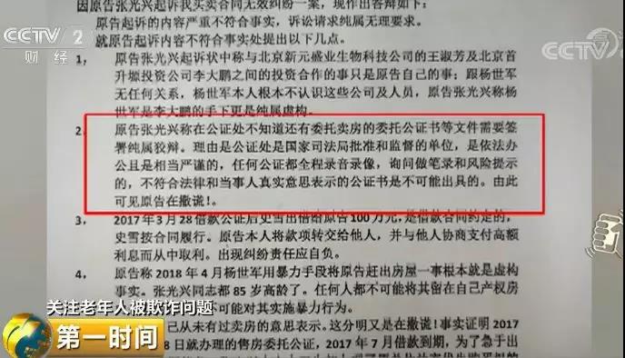 针对两位老人所说不知道在公证处还签有委托卖房公证书这一问题,卖掉老人房子的委托人杨世军在答辩状中称:公证处是司法局批准和监督的单位,是依法办公且是相当严谨的,不符合法律和当事人真实意思表示的公证书是不可能出具的。