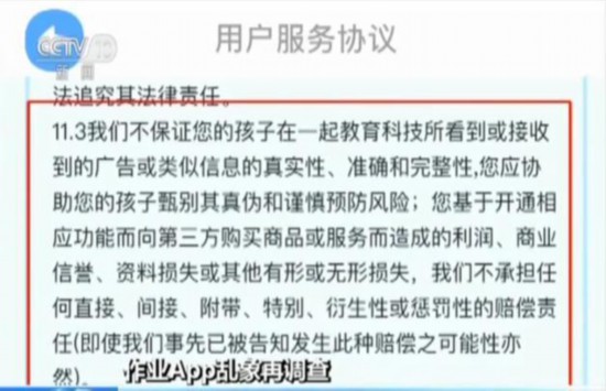 在“一起小学学生”这款App的《用户服务协议》里记者看到了这样的描述:“该平台不保证您的孩子在一起教育科技所看到或者接收到的广告或者类似信息的真实性、准确和完整性,您应协助您的孩子甄别其真伪和谨慎预防风险。该平台也不承担任何直接、间接、附带、特别、衍生性或惩罚性的责任,即使平台事先已被告知发生此种赔偿之可能性亦然。”一款针对中小学生使用的App,既可以开通网络游戏自称是为了帮助学生学习,还明确自己发布的广告内容不能确保真实同时不承担发布责任,有法律学者就指出如此“霸气”的协议为的不是保护学生权益,而是在为自己的违法违规行为推卸责任。