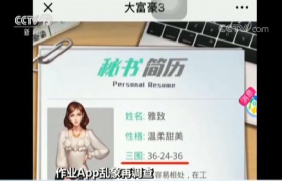 “互动作业”的微信公众号除了利用游戏引导中小学生进行社交,还包含大量性暗示、性诱惑、不良价值取向的网络游戏。记者在该公众号页面中一款名为“大富豪”的游戏中见到,用户进入首先要选择一个角色,而在选择成为主角后,游戏便会主动推送一个“秘书简历”的图片,上面包括了性格特点和女性的三围数据。