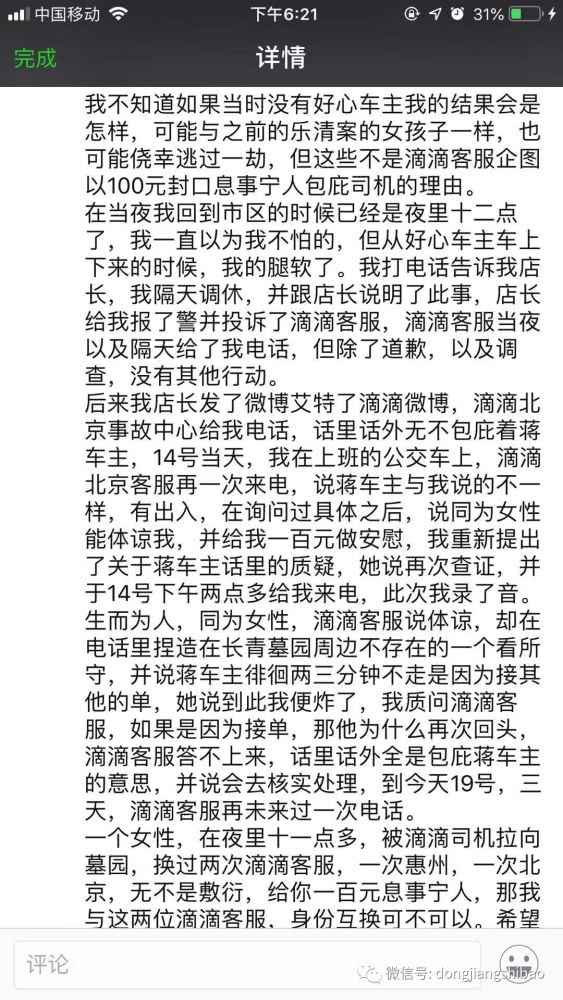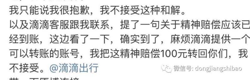 10月14号,滴滴总部客服再一次来电,称蒋姓司机与她所言有出入,在询问具体过程后,又称同为女性能够体谅,并提出给她一百元作为安慰。