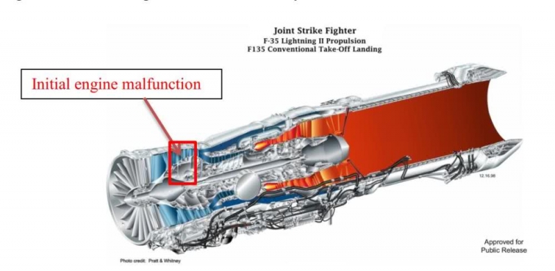 最终结果,就是喷零件!第三级风扇打破机匣后,击穿了四周的油箱,损坏了燃油管和液压管路,最终到处火势蔓延,实际上从这个角度来说,F35在生存力设计上比F15严重倒退了,他们自恃发动机技术高超,不会出事,将发动机四周遍布油箱,在发动机质量不是绝对百分百可靠的情况下,零件喷出打破油箱,整机烧毁!
