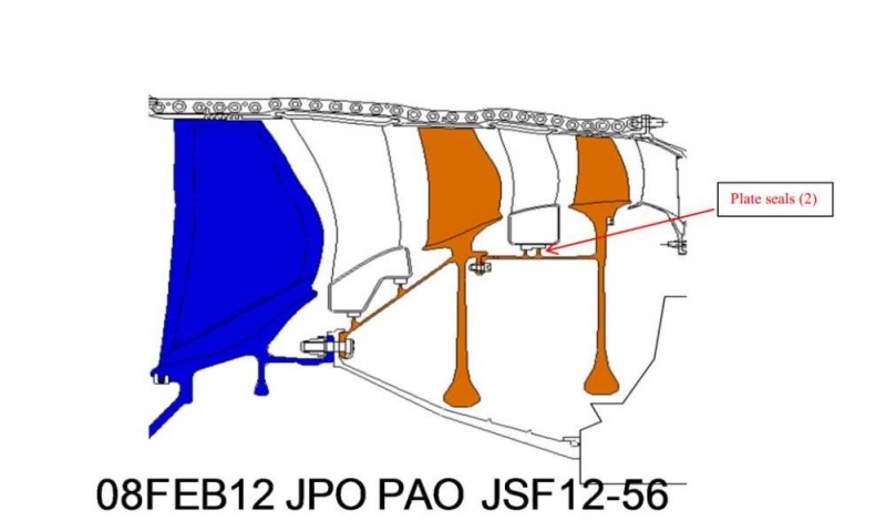 F35A的发动机F135,风扇部位由进口导流叶片和三级风扇组成,发动机为了提高效率尽量少漏气,采用了先进的密封板设计。