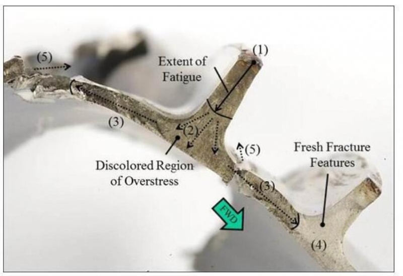 这一个典型的疲劳断裂故障,密封板按照12345的顺序开裂断裂,最终导致发动机事故