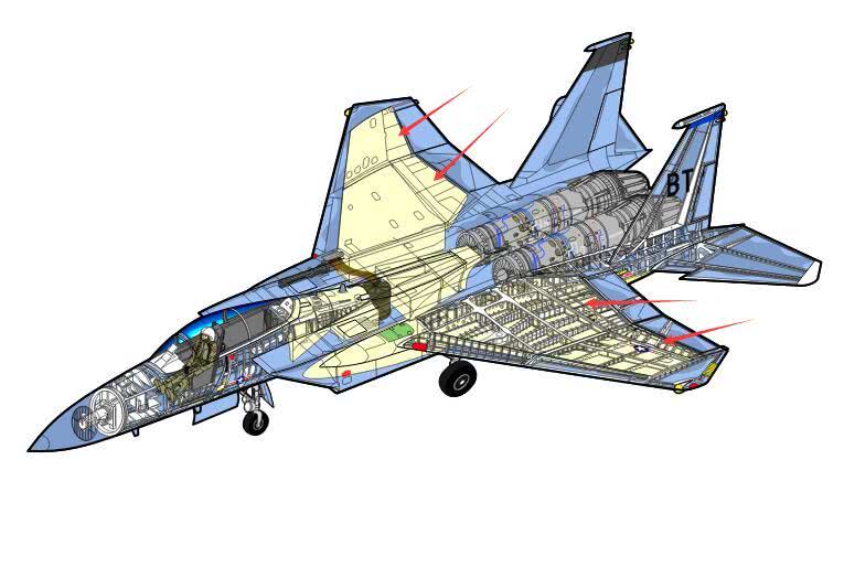 最初F15AB油箱和发动机是完全分离的,后来为了增加油量在4个危险区增加油箱