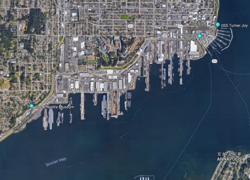 普吉特湾海军造船厂卫星照片,可以看到港内的航母