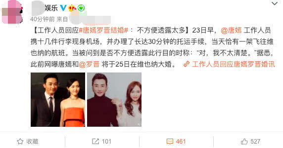 原标题:唐嫣罗晋25日在维也纳办婚礼 工作人员飞往维也纳却回应不清楚