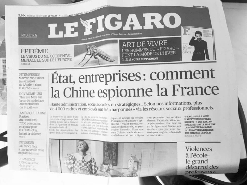【环球时报驻法国特约记者 姚蒙】“从国家到企业:中国是如何刺探法国情报的”——23日的法国《费加罗报》在头版头条刊文(如右图),用整整三个版面报道称,“中国从各个方面对法国进行情报刺探工作,对法国利益造成了损害”。