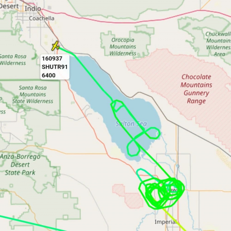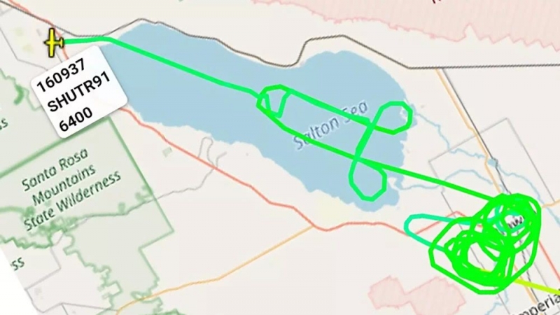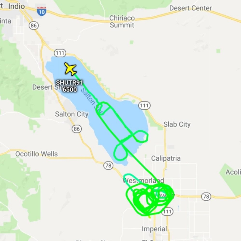 近日,疑似一架美国海军的T-34C教练机的飞行员,在美国加利福尼亚州东南部的索尔顿湖上空飞行时,又一次飞出了一个巨大的“生殖器”航线。但是这次飞行员并没有让战机留下肉眼可见的痕迹。只有一些飞行爱好者通过手机中的飞行软件才能看到这个清晰的不雅图案。因为飞行软件可以准确的绘制出飞机的全程航线。