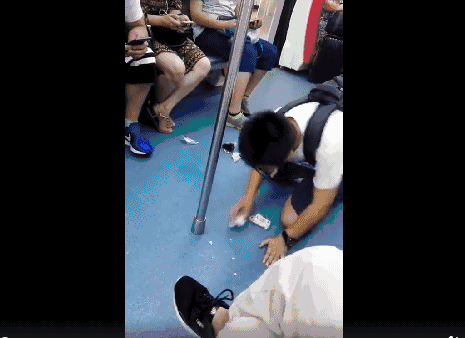 这个小男孩,面对别的小孩不小心弄到地上的水渍,他一边擦,一边给旁边抬脚的乘客说谢谢。