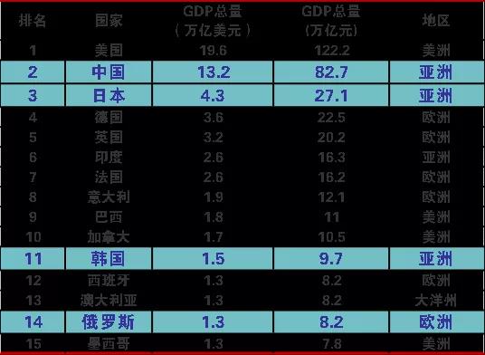 下面我们来看看2017年各国GDP排名:中国是世界第二大经济体,2017年GDP为13.2万亿美元;日本是第三大经济体,GDP为4.3万亿美元;韩国为1.5万亿美元;俄罗斯为1.3万亿美元。合计20.4万亿美元,超过了美国。