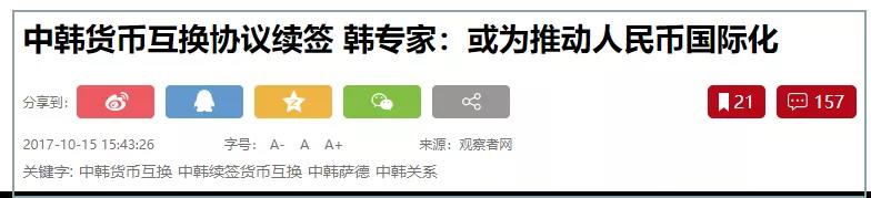 2017年10月13日,韩国银行宣布和中国人民银行续签货币互换协议,协议延长3年,规模为560亿美元(约合人民币3688亿元),与之前协议相同。