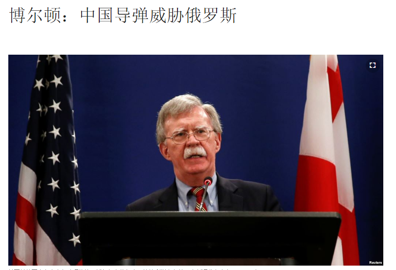 据美国媒体说,离开莫斯科的博尔顿去了格鲁吉亚。他26日在第比利斯接受路透社采访时表示,中国的导弹对俄罗斯构成威胁,其打击范围可包括“俄罗斯的心脏”地区。博尔顿同时还表示,华盛顿希望与莫斯科就中国的军事活动进行战略对话。