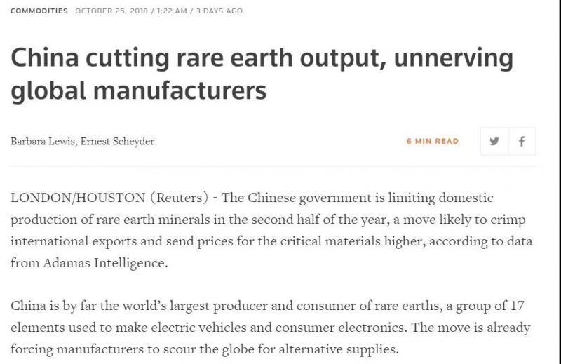 英国路透社10月24日报道,称中国削减稀土产量,全球制造商感到不安。密切跟踪稀土行业的阿达马斯商情(Adamas Intelligence)公司数据显示,2018年下半年,中国将稀土分离和冶炼配额削减36%,稀土生产限制在4.5万吨。这是5年多来的最低水平,这一行为旨在为中国国内买家提供足够的供应,并规范国际市场。