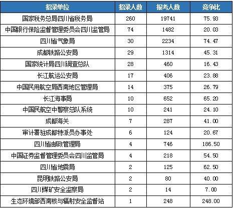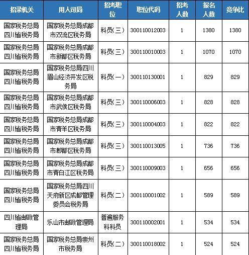 全省竞争比前十的岗位中,除了乐山市邮政管理局之外,其余部门均来自税务系统,成为唯一一个能与税务系统PK的部门。并且双流区国税及新都区国税的科员三职位竞争比破千。成为最难考职位。