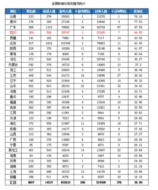 从全国各省份报名数据中可以看出,本次国考四川总招录500人,目前已有22426人过审,竞争比高达44.85,仅次于云南、贵州、广东位列第四。四川中公教育专家认为,本次国考职位数缩减严重但是并不影响考生报考激情,由此带来的最直接影响就是竞争更为严峻。