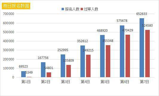 10月28日,2019国家公务员考试报名进入第七日。来自四川中公教育统计分析:截至28日,四川地区报名系统已经审核通过了652633人,平均竞争比为36:1,其中已经有524580人通过审核,目前仍有208个岗位报考人数还未破零,占2.1%。