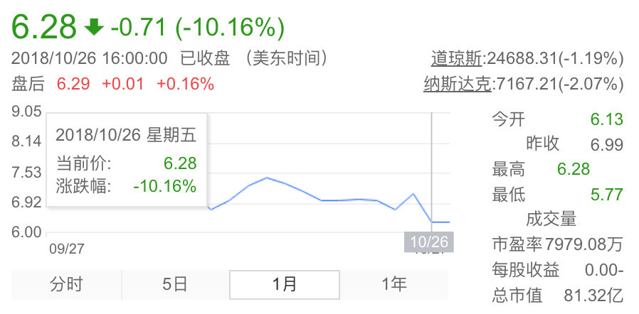 上市之后Snap的股价便一路下滑,IPO至今将近20个月,其股价已经不及开盘日的四分之一。截止10月26日,Snap的收盘价仅剩6.28美元,总市值约为81.32亿,相比市值高峰时已经缩水254亿美元。