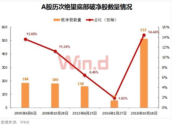 而在10月18日(本轮调整低点日期),这一数据曾达到513只,数量远超A股历史大底之时。当日破净股数量占全部A股比例为14.44%,不仅远超上证指数1664点时期以及1849点时期,而且超过了2005年上证指数跌至998点大底时的13.65%。