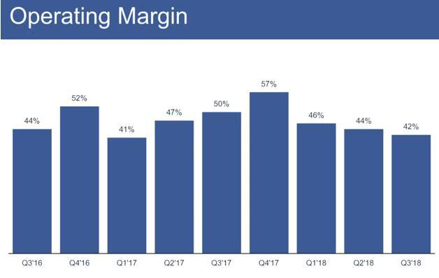 在收入增长放缓,成本增加明显的情况下,利润率的下降则变得难以避免。第三季度Facebook运营利润率为42%,是自2017年第一季度以来最低利润率水平。