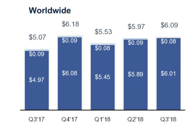 对于月活跃用户超过20亿的Facebook来说,用户增长遭遇瓶颈是难以避免的现实,在这样的情况下,维持业绩的增长将依靠对存量的进一步挖掘以及开拓新业务收入,从第三季度营收情况可以看出,除了在欧洲地区和其他地区平均每个用户贡献收入出现小幅下降以外,在北美(包括美国和加拿大)和亚太地区单个用户平均贡献收入均出现增长,从全球范围来看,第三季度平均单个用户收入为6.09美元,是今年以来最高水平。