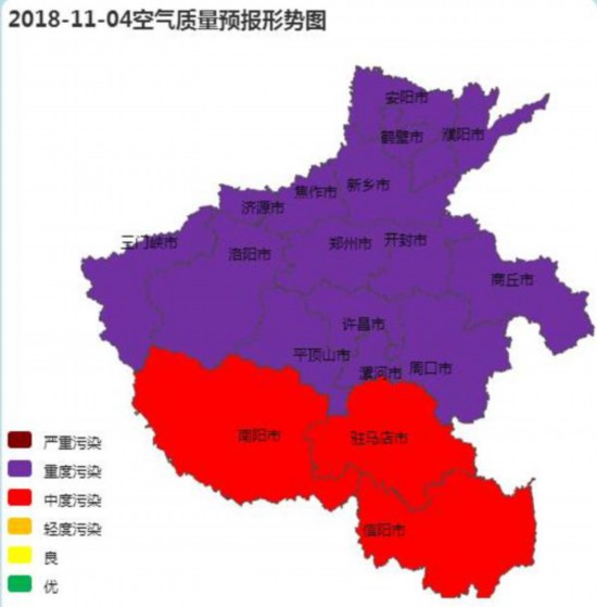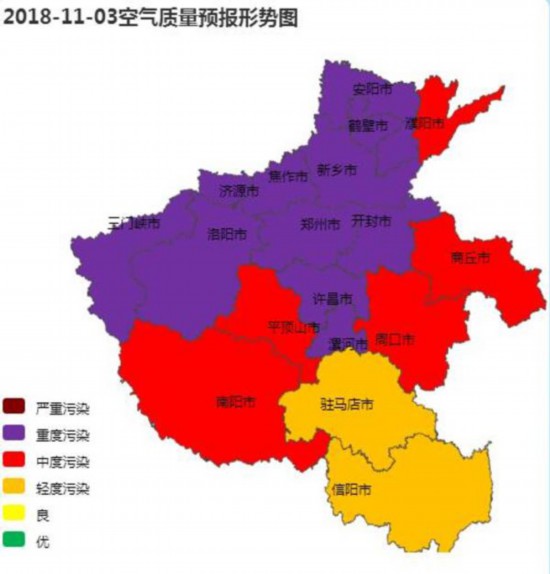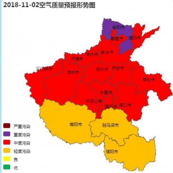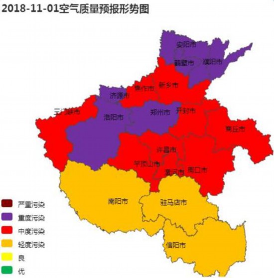 11月1日,早间,全省风力较弱、逆温严重,安阳、鹤壁、新乡、焦作、濮阳、济源、洛阳、三门峡、郑州、开封、许昌、漯河、平顶山13地为PM2.5中度或重度污染,其它地区出现PM2.5轻度污染;午后,风力加强,空气质量稍有转好,北中部转轻度污染或良,其它地区以良为主;夜间,大部分区域为轻度污染,安阳、鹤壁、新乡、濮阳、焦作、三门峡、济源、郑州、平顶山、许昌10地可能出现中度污染。预计日均:安阳、焦作、濮阳、三门峡、平顶山为中度或重度污染;商丘、信阳、南阳为良或轻度污染;其它地区为轻度污染或中度污染。