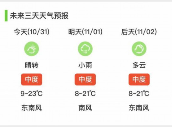 11月2日,凌晨时段,全省风力较弱、逆温较严重,出现PM2.5轻度或中度污染;白天至晚间,东南风加大至3到4级,中东部、南部地区转良,其它区域白天为良,夜晚转轻度及以上污染。预计日均:安阳、焦作、濮阳等地为中度污染;其它地区为良或轻度污染。