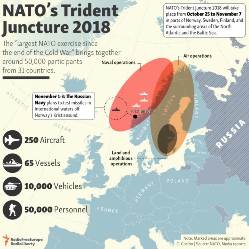 “三叉戟接点2018”是1990年以来,北约举行的最大规模多国联合演习。本次演习总共5万人的参演兵力中,包括了大约1.4万名美军官兵:除了出动杜鲁门号航母的美国海军,美国大部分参演兵力来自海军陆战队。他们用重型直升机、气垫登陆艇等多种手段,将人员和装备源源不断地送上挪威海岸。