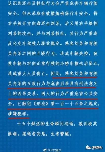 11月2日10:31,重庆警方通过官方微博“平安重庆”发布警情通报称,乘客刘某和司机冉某的互殴行为,造成车辆失控,导致重大人员伤亡,两人的互殴行为与危害后果具有刑法意义上的因果关系,两人的行为严重危害公共安全,涉嫌犯罪。