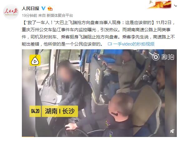 海外网11月2日电据人民日报官方微博消息,11月2日,重庆万州公交车坠江事件车内监控曝光,引发热议。而湖南高速公路上也发生过同类事件,当时司机及时刹车、乘客挺身飞踹阻止抢方向盘者。该乘客说,高速路上不能出差错,他所做的是一个公民应该做的。