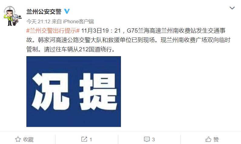 11月3日19:21,G75兰海高速兰州南收费站发生交通事故。韩家河高速公路交警大队和救援单位已到现场。现兰州南收费广场双向临时管制。请过往车辆从212国道绕行。