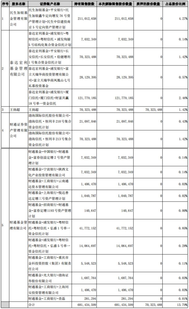 这是公司在一年前向民生加银基金管理有限公司、财通基金管理有限公司、财通证券资产管理有限公司、王扬超、泰达宏利基金管理有限公司5家公司非公开发行的股份。