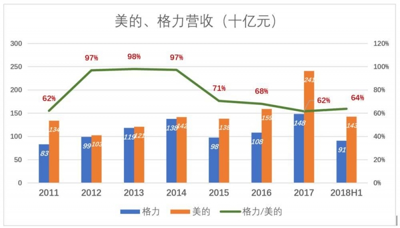 2015年,两家终于拉开差距。到2017年格力营收跌至美的的62%,回到2011年的水平。#终点又回到起点#