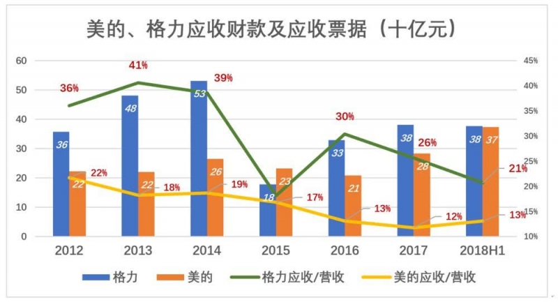 连续三年,格力看到友商只用五成功力对付自己,意识到追赶无望,2015年终于放弃。“应收账款”、“应收票据”合计占营收的比例大幅跌至18%,格力及其经销商总算松了一口气。