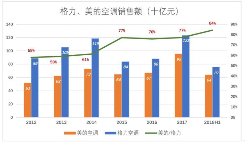 2012年,美的、格力空调销售额分别为515亿和889亿,美的相当于格力的58%。2018年H1,两家空调销售额分别为639亿主758亿,美的已达到格力的84%。