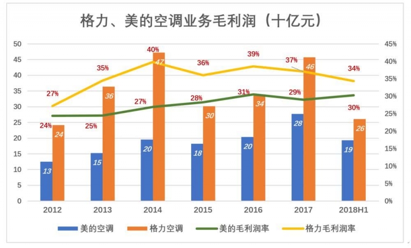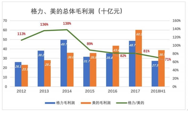 但也就在2015年,形势发生逆转。这一年美的毛利润比格力多40.5亿。2018年H1,美的比格力多赚114.3亿!