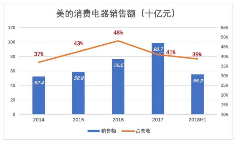 反观美的洗衣机、冰箱、微波炉、热水器、电饭煲、净水器等家电产品市场份额均进入行业前3位。2017年,美的空调之外的“消费电器”销售收入988亿,占总营收的41%。