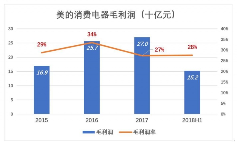 美的“消费电器”毛利润率在30%左右。2018年H1毛利润152亿,毛利润率27.6%,比空调业务低两三个百分点。