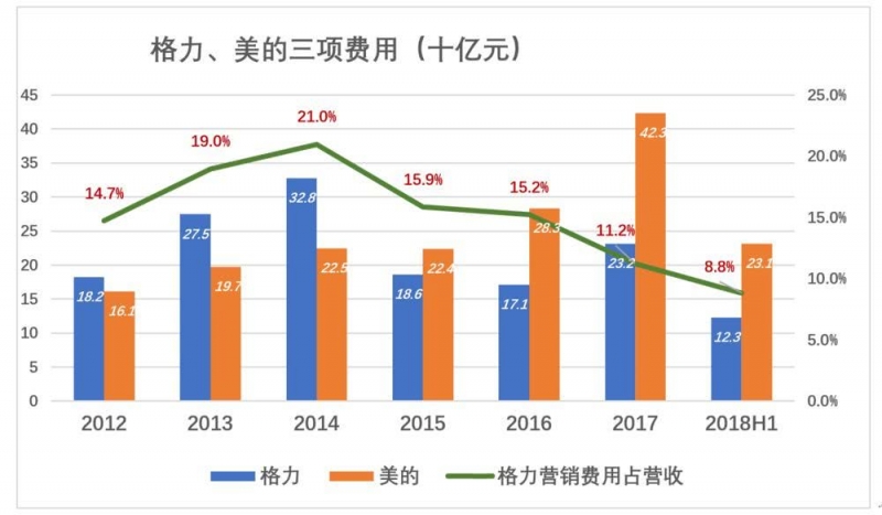 此后格力三项费用连年低于美的。营销费用占营收的比例从2014年的21%一路降至2018年H1的8.8%,是主要的压缩对象。