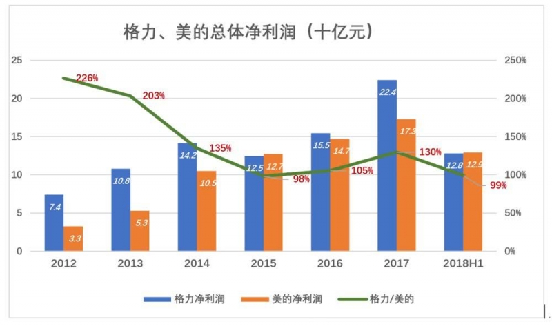 2017年格力毛利润率还比美的高7.8个百分点,2018年H1领先优势只剩下2.9个百分点,这是格力净利润被反超的根本原因。