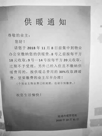 11月2日,记者在小区注意到,这份供暖通知显示,业主11月8日以前到物业办公室缴纳取暖费按照每平方米18元收取,11月9日至11月14日缴纳则按照每平方米20元收取。通知强调,已入住且不缴纳供暖费用的,按供暖总费用的30%收取“蹭暖费”。该通知落款为陆通冷暖管理处,时间为2018年10月31日。