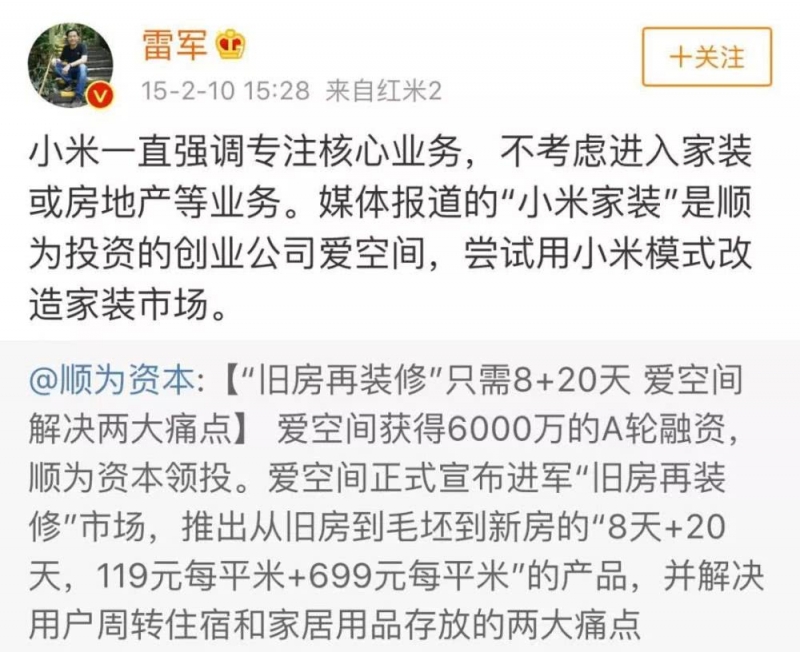 雷军哪肯让董明珠就这样“糊弄”过去,不但在接受央视采访时表示“小米并未涉足房地产,也没有做房地产的计划”,还专门发了一条微博,称“小米一直强调专注核心业务,不考虑进入家装或房地产等业务。”
