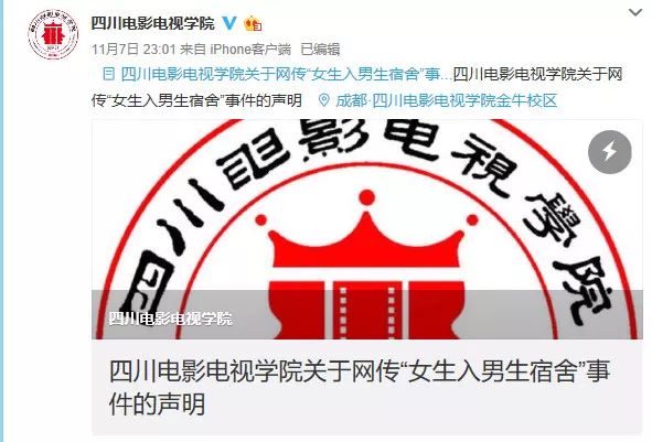 近日,网络上关于四川电影电视学院安仁校区“女生入男生宿舍”事件的众多传言引起公众关注。昨日,该院在其官网发布声明,称该事件系涉事女生陈某某恋爱遇阻,为引起网络关注,在“情绪不稳”状态下杜撰发布了有关内容。
