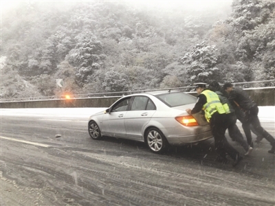 “随着降雪持续,截止到7日傍晚,受降雪影响路段达到39公里,部分路段积雪达到20厘米左右,此时还有数百辆车在冰雪路段。”六支队的民警介绍,因为路面结冰,加上该路段又是上坡,车辆打滑十分严重,行驶十分困难,交警只能用手推动车辆,助其脱困。