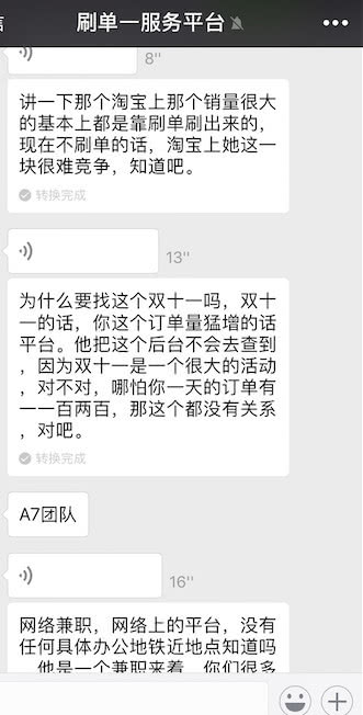 名为A7团队的刷单平台客服张莉直言不讳地说:“你别看有些商家的销量很大,基本上都是靠刷出来的。‘双十一’是一个非常重要的转折点,不刷单你很难与其他商家竞争,一旦刷出爆款,你就能打出名气。”