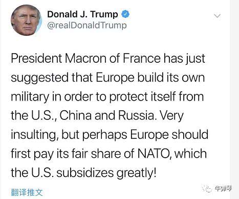 法国总统马克龙刚刚建议,欧洲应该建立自己的军队,保护自己不受美国、中国、俄罗斯的侵犯,非常侮辱人,但也许欧洲应该首先支付北约的合理费用,美国补贴得太多了!