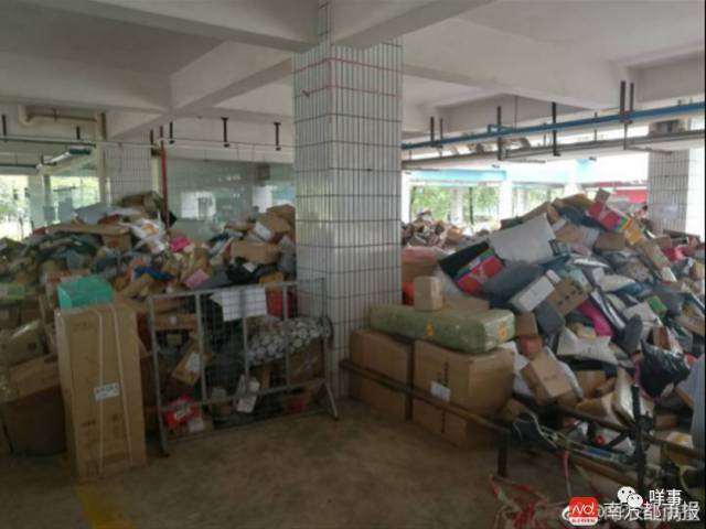 华农自11月12日起快递成车进入校园宿舍区,快递量翻倍,分拣快递时堆放如小山。