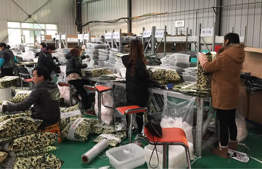 2018年是打包员王华兴从事该行业的第5个年头,他抱着已经装箱的商品给中新经纬客户端(微信公众号:jwview)介绍,每个打包区域四人一组,一人将商品装入泡沫盒,一人封外包装盒,一人装箱,最后由王华兴用胶带封箱。