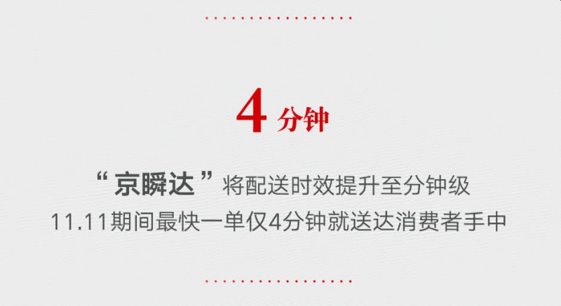 为全面提升用户体验,京东物流从消费者的需求出发,不断升级个性化服务,树立行业标杆,今年11.11期间,“京瞬达”服务将分钟级配送时效提升至极致,北京市朝阳区尤先生购买一款熟食,下单后仅4分钟,京东小哥就送货上门。