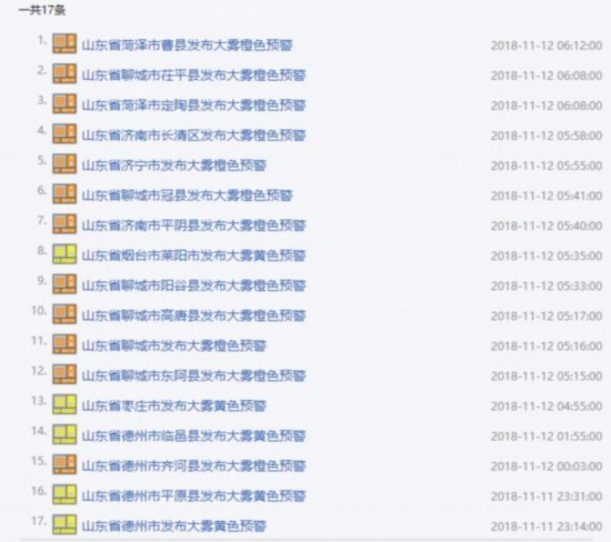 周末连续两天又阴又冷,是不是有一点不适呢?由于天气原因,华北地区大气扩散条件逐渐转差。今天早上,山东迎来大范围大雾天气。山东省气象台共计发布了17个大雾预警信号。